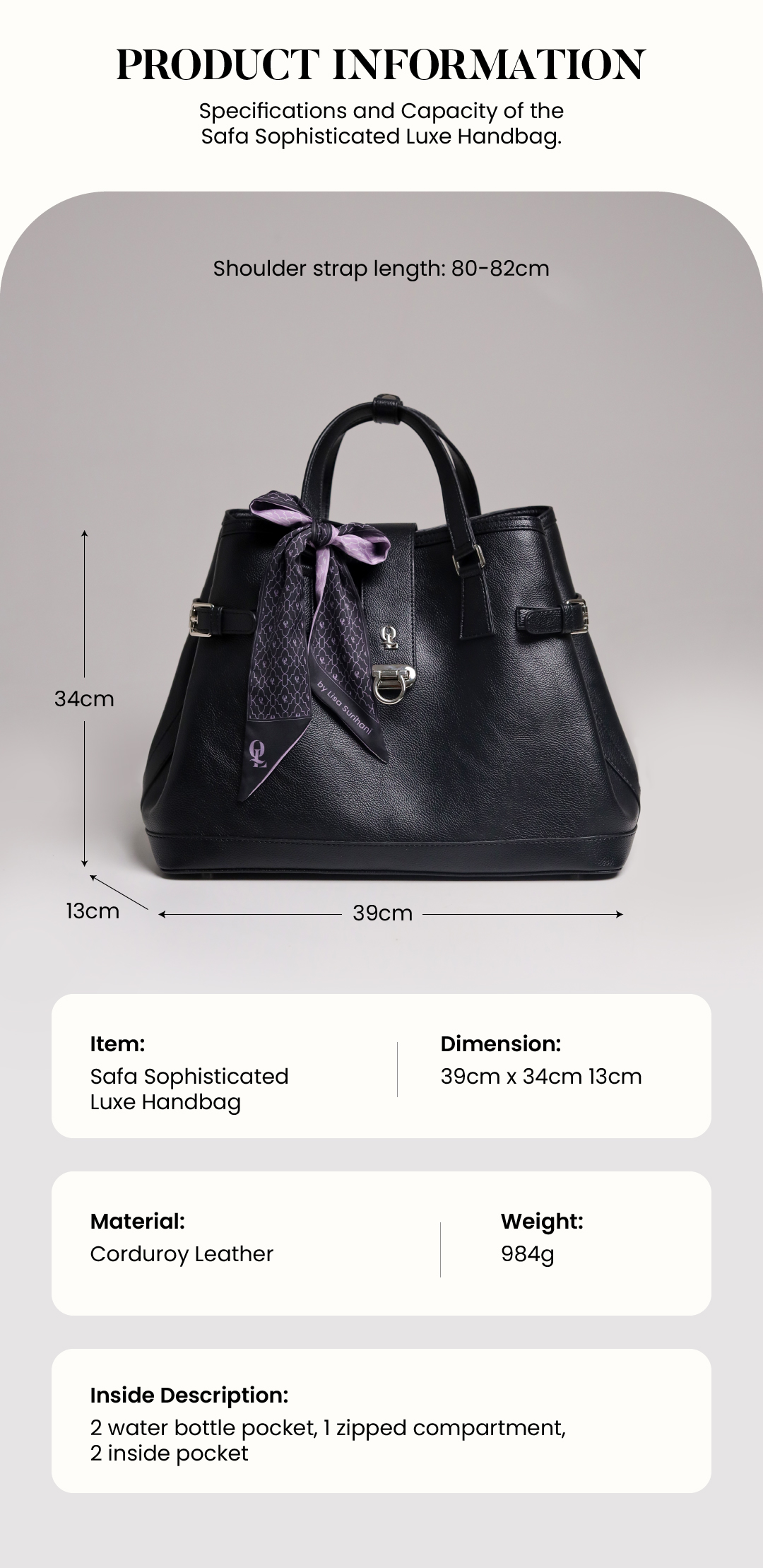 Produk ini merupakan bagian dari Koleksi Eksklusif Safa dan Marwa, Qalby x Lisa Surihani. Tas ini didesain khusus untuk Muslimah modern, dengan memadukan keanggunan dan kepraktisan. Tas ini sangat cocok untuk berbagai acara, baik formal maupun semi-formal, dengan tampilan yang timeless namun tetap berkelas, menjadikannya ideal untuk dipakai sehari-hari, termasuk untuk bekerja dan halaqah (majelis).